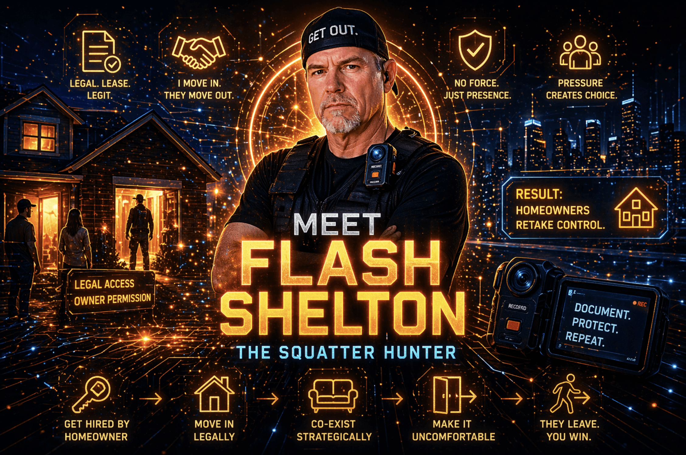He gets hired to deal with squatters.