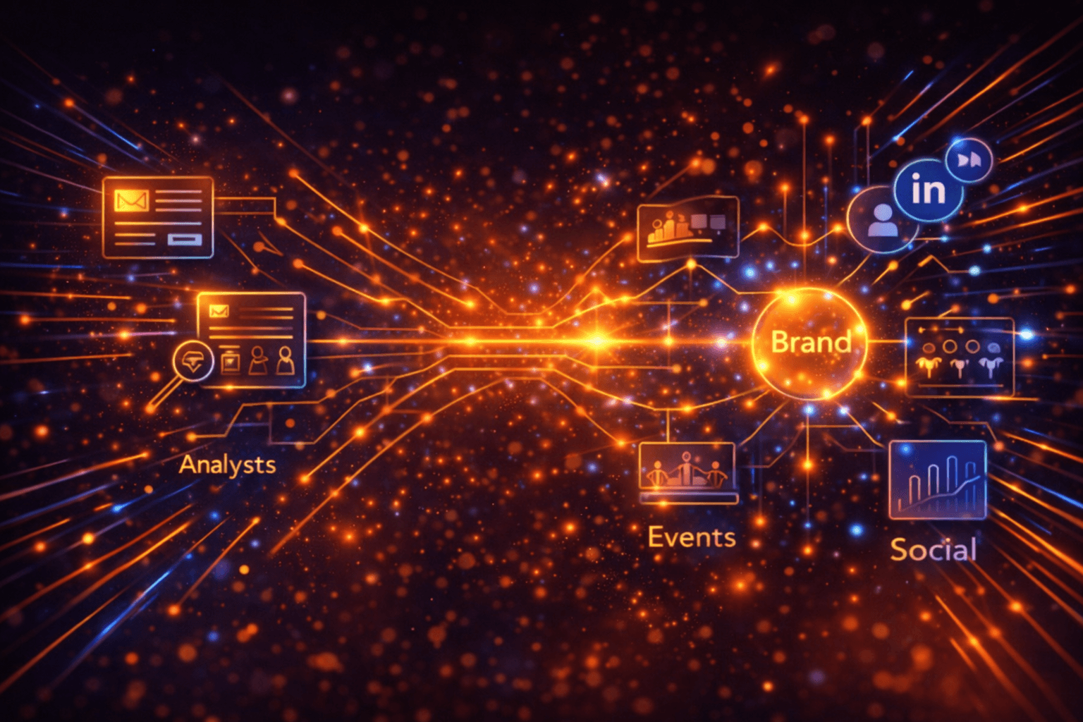 A coordinated system of press, analysts, podcasts, events, and LinkedIn working together to build visibility and authority.